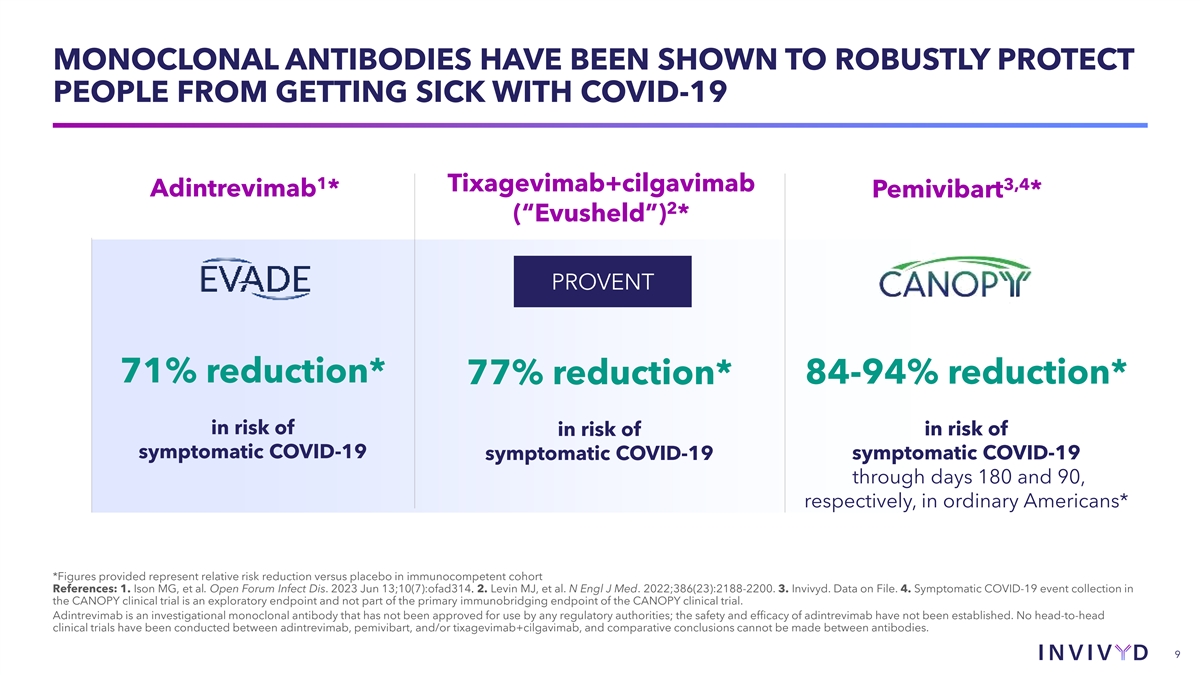 MONOCLONAL ANTIBODIES HAVE BEEN SHOWN TO ROBUSTLY PROTECT PEOPLE FROM GETTING SICK WITH COVID-19 1 3,4 Tixagevimab+cilgavimab Adintrevimab * Pemivibart * 2 (“Evusheld”) * PROVENT 71% reduction* 84-94% reduction* 77% reduction* in risk of in risk of in risk of symptomatic COVID-19 symptomatic COVID-19 symptomatic COVID-19 through days 180 and 90, respectively, in ordinary Americans* *Figures provided represent relative risk reduction versus placebo in immunocompetent cohort References: 1. Ison MG, et al. Open Forum Infect Dis. 2023 Jun 13;10(7):ofad314. 2. Levin MJ, et al. N Engl J Med. 2022;386(23):2188-2200. 3. Invivyd. Data on File. 4. Symptomatic COVID-19 event collection in the CANOPY clinical trial is an exploratory endpoint and not part of the primary immunobridging endpoint of the CANOPY clinical trial. Adintrevimab is an investigational monoclonal antibody that has not been approved for use by any regulatory authorities; the safety and efficacy of adintrevimab have not been established. No head-to-head clinical trials have been conducted between adintrevimab, pemivibart, and/or tixagevimab+cilgavimab, and comparative conclusions cannot be made between antibodies. 9
